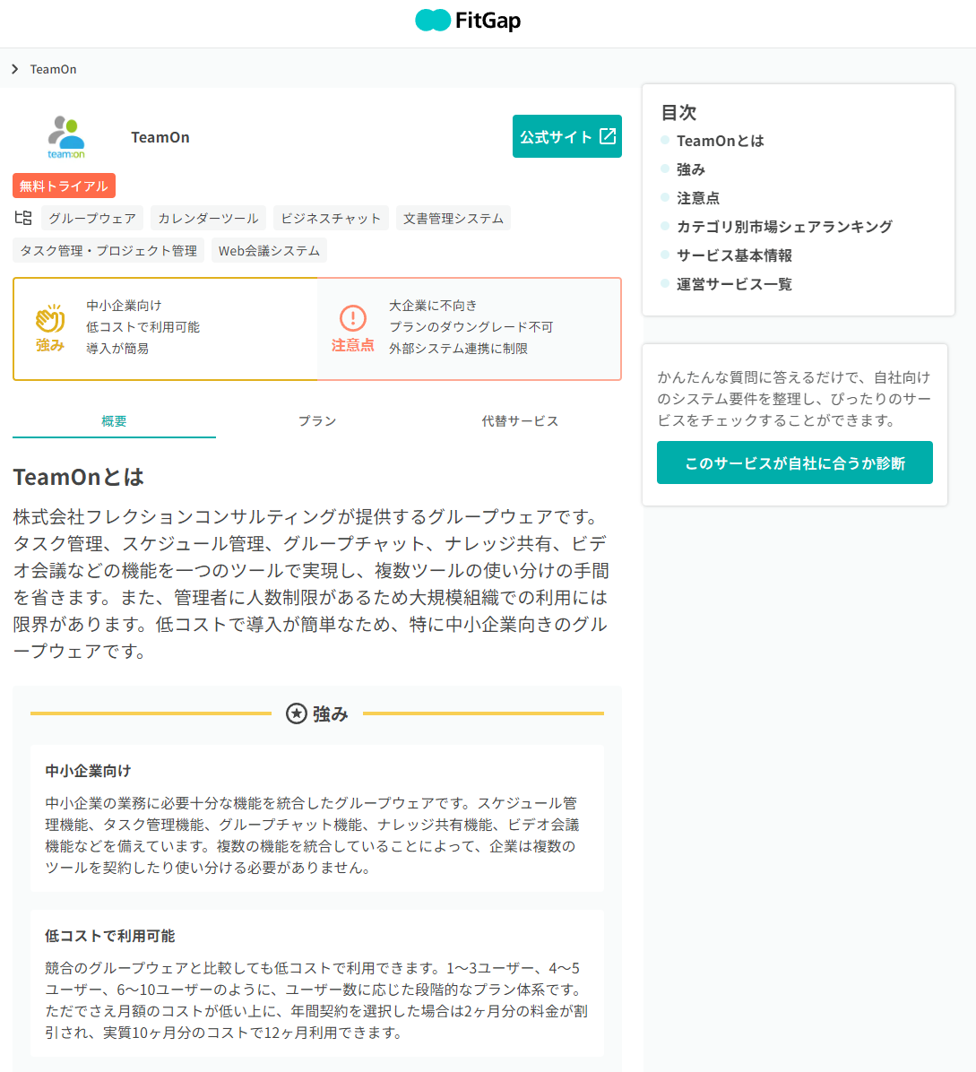 自社にぴったりのサービスを選ぶための無料診断サービス「FitGap」にて「TeamOnが紹介されました。